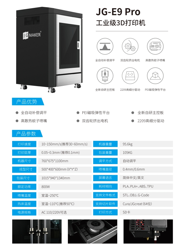極光創新JG-E9 Pro作為極光創新工業級FDM系列3D打印機的王牌產品,在教育科研、工業制造等領域深受好評,除了擁有500*400*600mm的較大成型尺寸之外,全封閉空間的鈑金結構機身,不僅可以很好的控制機箱溫度,有效提升打印精度。同時,該款機器的內置配置也是直接拉滿,集成化設備管理系統、先進的熱感控制系統、四軸靜音驅動主板、大流量高散熱蚊子噴頭等齊全的內核配置,全方位保障3D打印模型的成型率。