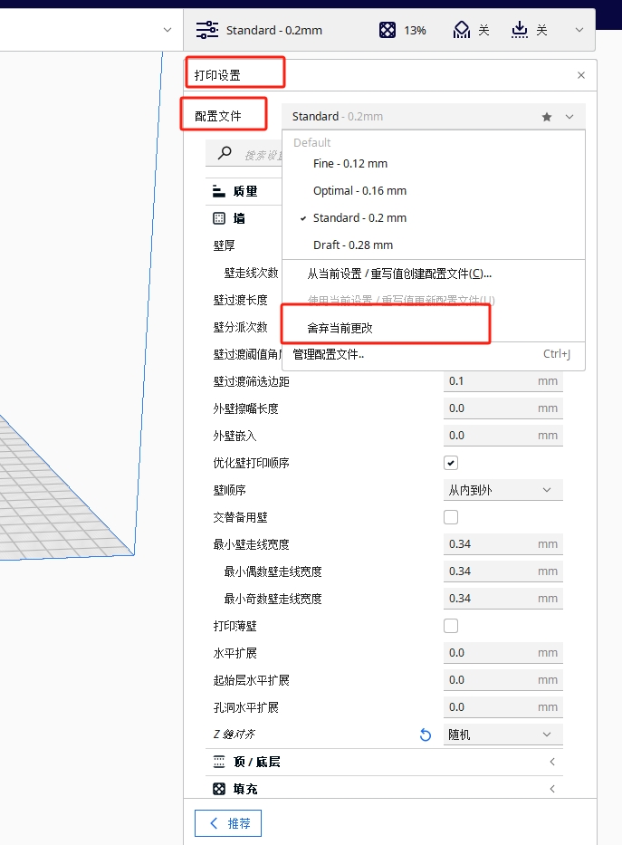 很簡單,您只需在軟件右邊“打印設置”-“配置文件”中點擊“舍棄當前更改”就可以恢復到默認設置。