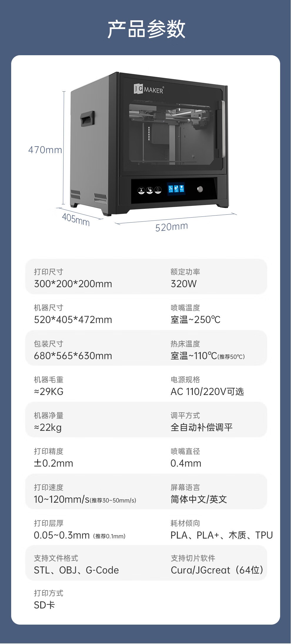支持文件格式:STL, OBJ、 G-Code機器尺寸:520*405*472mm