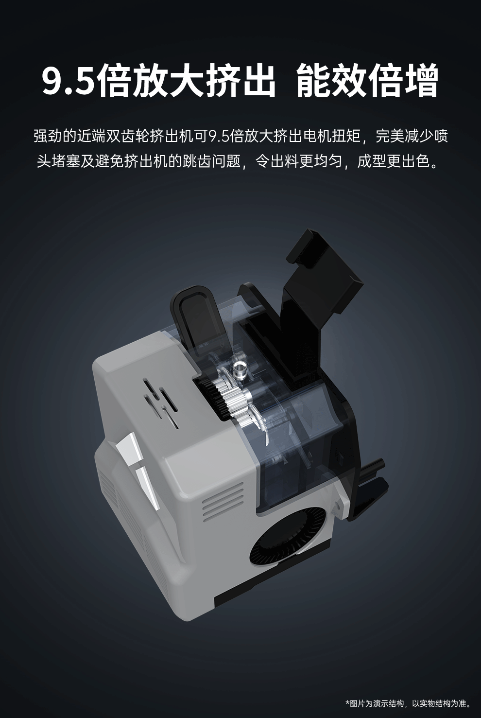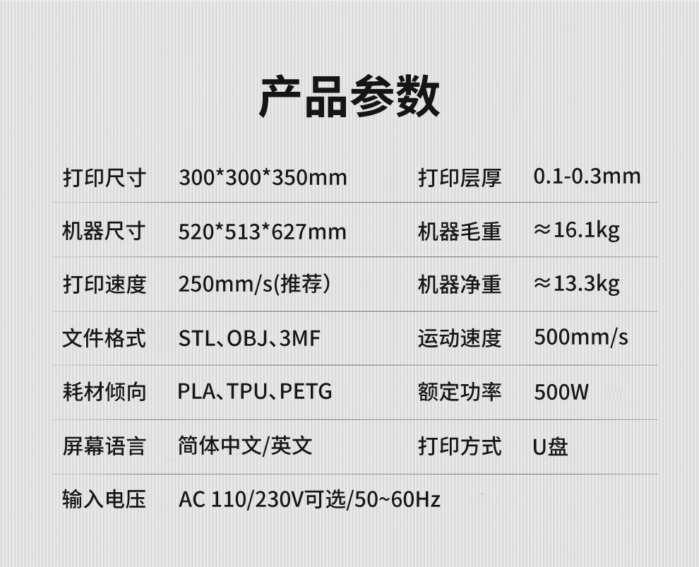 300*300*350mm最大成型空間·9.5倍放大擠出,使出料更均勻,成型更出色,搭載智能風扇控制系統,讓高達8500r/min的轉速降低噪音,還可以模型散熱更全面的同時高速打印
